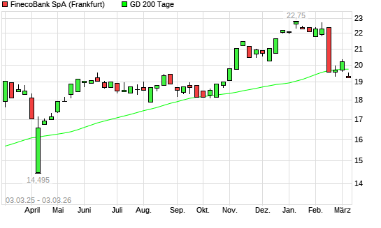 Mit dem Rücksetzer auf 19,34 EUR hat die FinecoBank-Aktie am 02.03.2026 die 200-Tage-Linie nach unten gekreuzt.