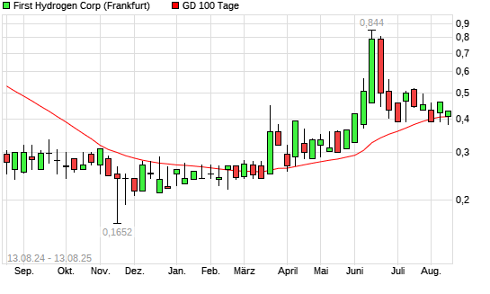 Mit dem Anstieg auf 0,41 EUR hat die First Hydrogen-Aktie am 12.08.2025 die 100-Tage-Linie nach oben gekreuzt.