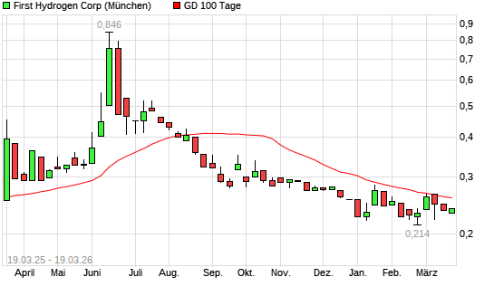 Mit dem Rücksetzer auf 0,22 EUR hat die First Hydrogen-Aktie am 18.03.2026 die 100-Tage-Linie nach unten gekreuzt.
