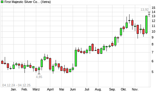 Mit dem Anstieg auf 13,56 EUR hat die First Majestic Silver-Aktie (ISIN CA32076V1031) am 03.12.2025 ein neues 3-Jahres-Hoch erreicht und damit den Kurs vom 01.12.2025 eingestellt.