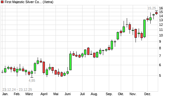 Mit dem Anstieg auf 14,87 EUR hat die First Majestic Silver-Aktie (ISIN CA32076V1031) am 22.12.2025 ein neues 3-Jahres-Hoch erreicht und damit den Kurs vom 11.12.2025 eingestellt.