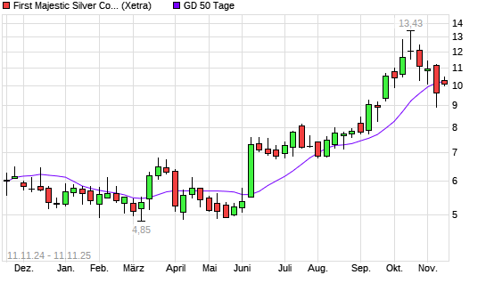 Mit dem Anstieg auf 10,34 EUR hat die First Majestic Silver-Aktie am 10.11.2025 die 50-Tage-Linie nach oben gekreuzt.