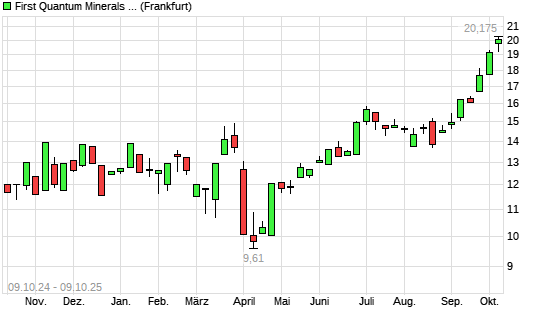 Mit dem Anstieg auf 20,18 EUR hat die First Quantum Minerals-Aktie (ISIN CA3359341052) am 08.10.2025 ein neues 12-Monats-Hoch erreicht und damit den Kurs vom 07.10.2025 eingestellt.