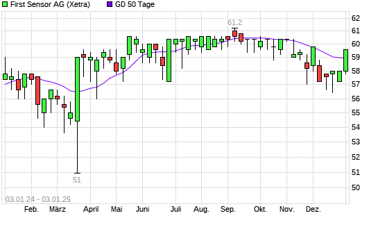 Mit dem Anstieg auf 58,60 EUR hat die First Sensor-Aktie am 02.01.2025 die 50-Tage-Linie nach oben gekreuzt.
