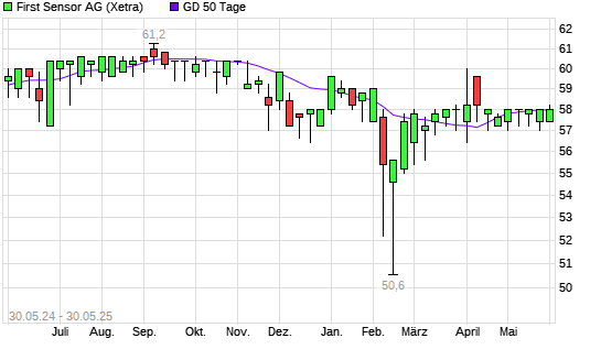 Mit dem Anstieg auf 58,00 EUR hat die First Sensor-Aktie am 29.05.2025 die 50-Tage-Linie nach oben gekreuzt.