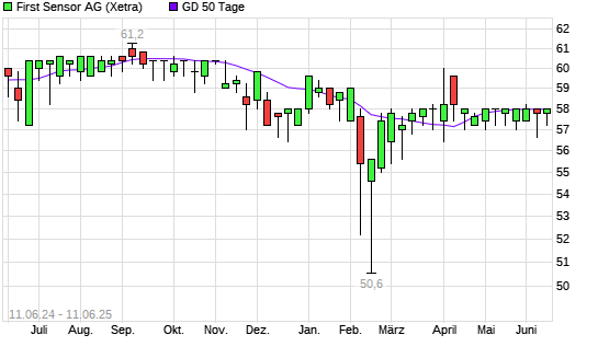 Mit dem Anstieg auf 58,00 EUR hat die First Sensor-Aktie am 10.06.2025 die 50-Tage-Linie nach oben gekreuzt.