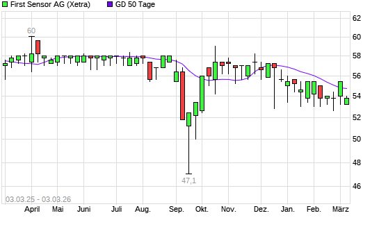 Mit dem Anstieg auf 54,80 EUR hat die First Sensor-Aktie am 02.03.2026 die 50-Tage-Linie nach oben gekreuzt.