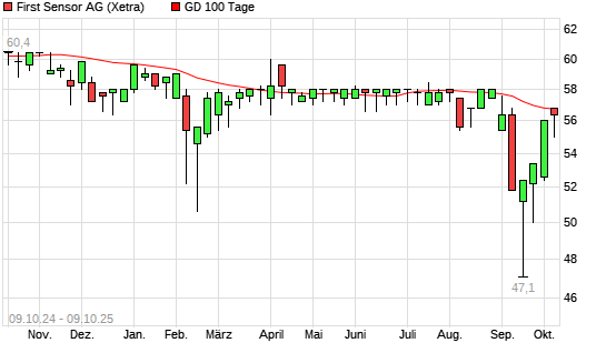 Mit dem Rücksetzer auf 56,00 EUR hat die First Sensor-Aktie am 08.10.2025 die 100-Tage-Linie nach unten gekreuzt.