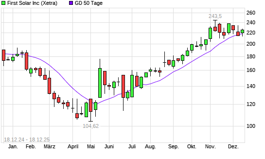 Mit dem Anstieg auf 220,35 EUR hat die First Solar-Aktie am 17.12.2025 die 50-Tage-Linie nach oben gekreuzt.