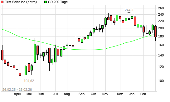 Mit dem Rücksetzer auf 175,46 EUR hat die First Solar-Aktie am 25.02.2026 die 200-Tage-Linie nach unten gekreuzt.