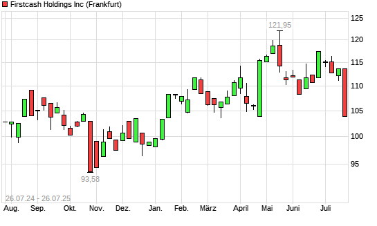 Mit dem Rücksetzer auf 103,85 EUR hat die FirstCash Holdings-Aktie (ISIN US33768G1076) am 25.07.2025 ein neues 6-Monats-Tief erreicht und damit den Kurs vom 22.04.2025 eingestellt.