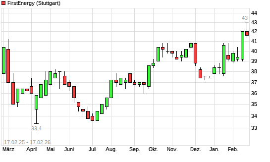Mit dem Anstieg auf 41,80 EUR hat die FirstEnergy-Aktie (ISIN US3379321074) am 16.02.2026 ein neues 3-Jahres-Hoch erreicht und damit den Kurs vom 26.02.2025 eingestellt.