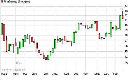 Mit dem Anstieg auf 42,40 EUR hat die FirstEnergy-Aktie (ISIN US3379321074) am 17.02.2026 ein neues 3-Jahres-Hoch erreicht und damit den Kurs vom 16.02.2026 eingestellt.