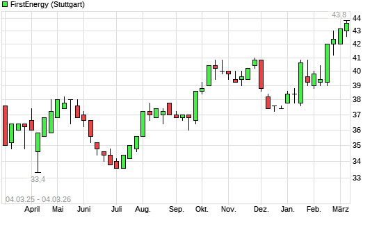 Mit dem Anstieg auf 43,20 EUR hat die FirstEnergy-Aktie (ISIN US3379321074) am 03.03.2026 ein neues 3-Jahres-Hoch erreicht und damit den Kurs vom 25.02.2026 eingestellt.