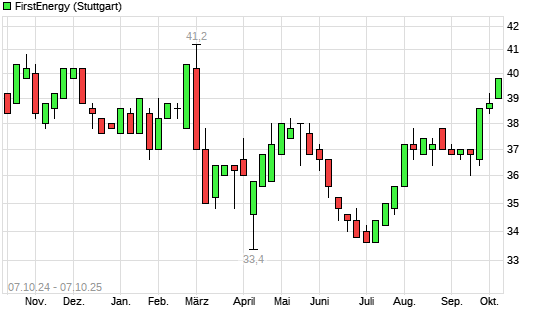 Mit dem Anstieg auf 39,00 EUR hat die FirstEnergy-Aktie (ISIN US3379321074) am 06.10.2025 ein neues 6-Monats-Hoch erreicht und damit den Kurs vom 02.10.2025 eingestellt.