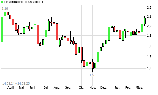 Mit dem Anstieg auf 2,07 hat die Firstgroup-Aktie (ISIN GB0003452173) am 13.03.2025 ein neues 6-Monats-Hoch erreicht und damit den Kurs vom 12.03.2025 eingestellt.