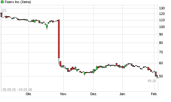 Mit dem Rücksetzer auf 49,35 EUR hat die Fiserv-Aktie (ISIN US3377381088) am 03.02.2026 ein neues 5-Jahres-Tief erreicht und damit den Kurs vom 21.11.2025 eingestellt.