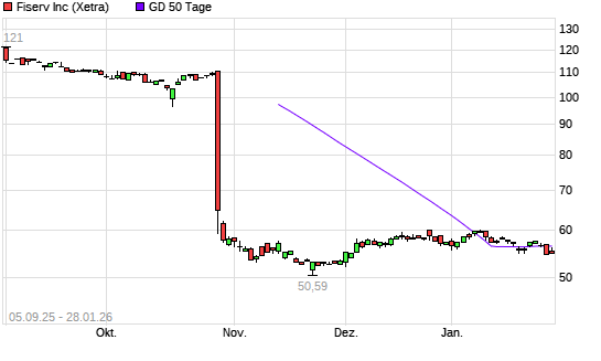 Mit dem Rücksetzer auf 56,33 EUR hat die Fiserv-Aktie am 27.01.2026 die 50-Tage-Linie nach unten gekreuzt.