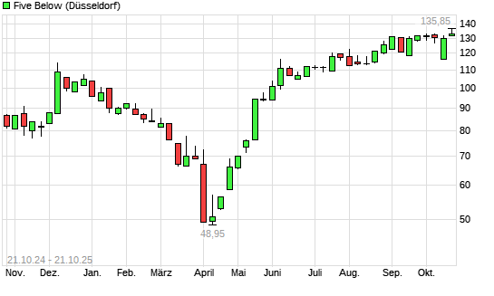 Mit dem Anstieg auf 133,70 EUR hat die Five Below,-Aktie (ISIN US33829M1018) am 20.10.2025 ein neues 12-Monats-Hoch erreicht und damit den Kurs vom 02.10.2025 eingestellt.