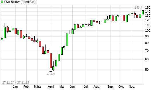 Mit dem Anstieg auf 143,40 EUR hat die Five Below,-Aktie (ISIN US33829M1018) am 26.11.2025 ein neues 12-Monats-Hoch erreicht und damit den Kurs vom 25.11.2025 eingestellt.