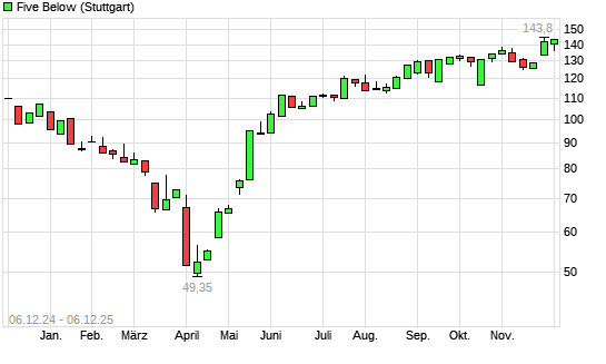Mit dem Anstieg auf 148,90 EUR hat die Five Below,-Aktie (ISIN US33829M1018) am 05.12.2025 ein neues 12-Monats-Hoch erreicht und damit den Kurs vom 04.12.2025 eingestellt.