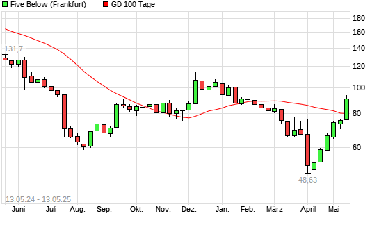 Mit dem Anstieg auf 80,56 EUR hat die Five Below,-Aktie am 12.05.2025 die 100-Tage-Linie nach oben gekreuzt.