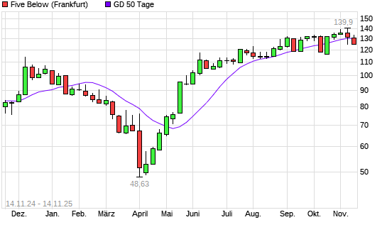Mit dem Rücksetzer auf 126,00 EUR hat die Five Below,-Aktie am 13.11.2025 die 50-Tage-Linie nach unten gekreuzt.