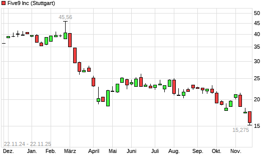 Mit dem Rücksetzer auf 15,29 EUR hat die Five9-Aktie (ISIN US3383071012) am 21.11.2025 ein neues 5-Jahres-Tief erreicht und damit den Kurs vom 18.11.2025 eingestellt.