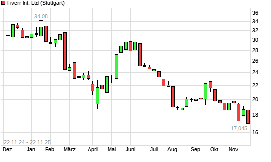 Mit dem Rücksetzer auf 17,10 EUR hat die Fiverr International-Aktie (ISIN IL0011582033) am 21.11.2025 ein neues 5-Jahres-Tief erreicht und damit den Kurs vom 19.11.2025 eingestellt.