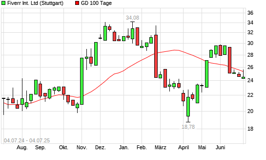 Mit dem Rücksetzer auf 24,54 EUR hat die Fiverr International-Aktie am 03.07.2025 die 100-Tage-Linie nach unten gekreuzt.