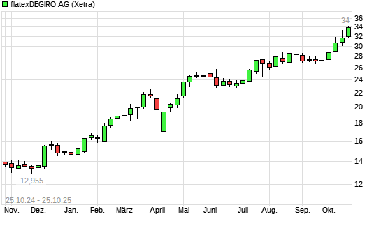Mit dem Anstieg auf 33,74 EUR hat die Flatexdegiro-Aktie (ISIN DE000FTG1111) am 24.10.2025 ein neues All-Time-High erreicht und damit den Kurs vom 23.10.2025 eingestellt.