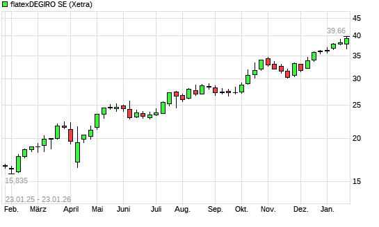 Mit dem Anstieg auf 38,74 EUR hat die Flatexdegiro-Aktie (ISIN DE000FTG1111) am 22.01.2026 ein neues All-Time-High erreicht und damit den Kurs vom 13.01.2026 eingestellt.