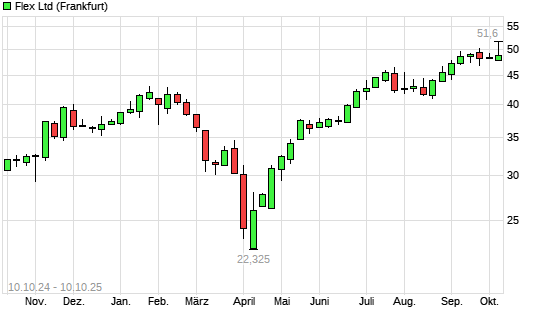 Mit dem Anstieg auf 51,60 EUR hat die Flex-Aktie (ISIN SG9999000020) am 09.10.2025 ein neues All-Time-High erreicht und damit den Kurs vom 24.09.2025 eingestellt.