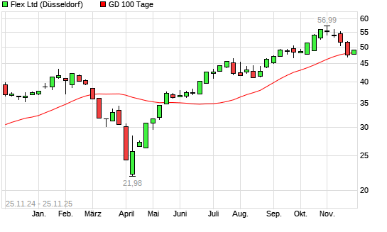 Mit dem Anstieg auf 49,29 EUR hat die Flex-Aktie am 24.11.2025 die 100-Tage-Linie nach oben gekreuzt.