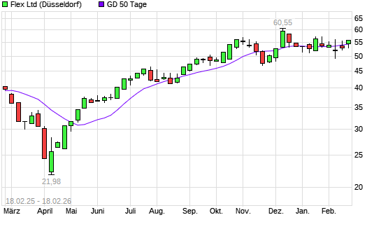Mit dem Rücksetzer auf 54,03 EUR hat die Flex-Aktie am 17.02.2026 die 50-Tage-Linie nach unten gekreuzt.