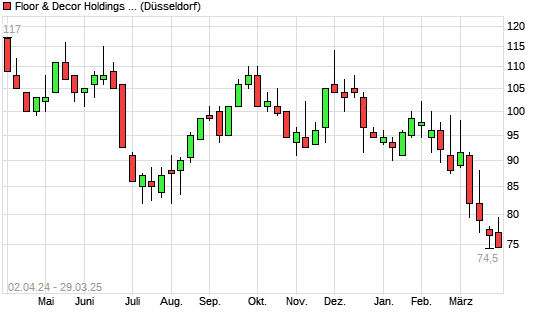 Mit dem Rücksetzer auf 73,50 EUR hat die Floor & Decor Holdings-Aktie (ISIN US3397501012) am 28.03.2025 ein neues 12-Monats-Tief erreicht und damit den Kurs vom 19.03.2025 eingestellt.