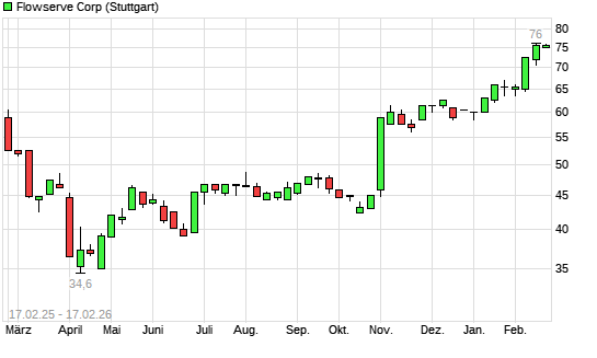 Mit dem Anstieg auf 75,50 EUR hat die Flowserve-Aktie (ISIN US34354P1057) am 16.02.2026 ein neues All-Time-High erreicht und damit den Kurs vom 13.02.2026 eingestellt.