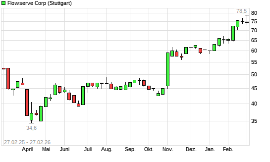 Mit dem Anstieg auf 77,00 EUR hat die Flowserve-Aktie (ISIN US34354P1057) am 26.02.2026 ein neues All-Time-High erreicht und damit den Kurs vom 25.02.2026 eingestellt.