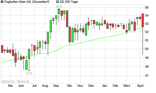 Mit dem Anstieg auf 52,80 EUR hat die Flughafen Wien-Aktie am 08.04.2025 die 200-Tage-Linie nach oben gekreuzt.