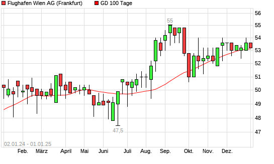 Mit dem Rücksetzer auf 53,20 EUR hat die Flughafen Wien-Aktie am 31.12.2024 die 100-Tage-Linie nach unten gekreuzt.