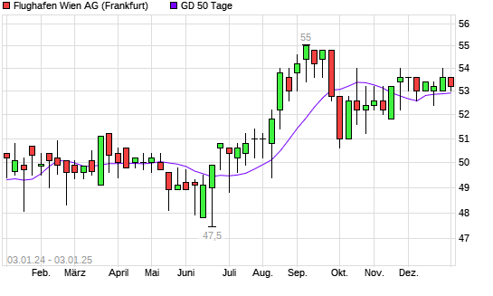 Mit dem Rücksetzer auf 53,00 EUR hat die Flughafen Wien-Aktie am 02.01.2025 die 50-Tage-Linie nach unten gekreuzt.