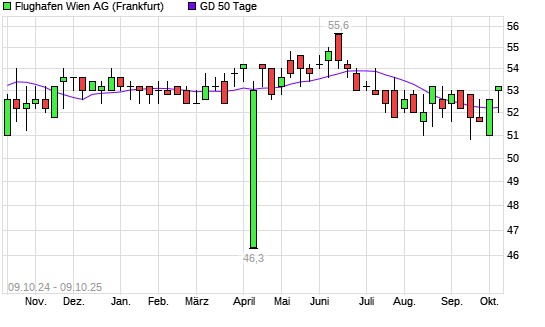 Mit dem Rücksetzer auf 52,00 EUR hat die Flughafen Wien-Aktie am 08.10.2025 die 50-Tage-Linie nach unten gekreuzt.