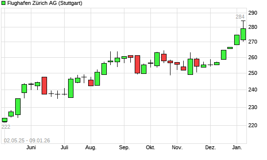 Mit dem Anstieg auf 280,60 EUR hat die Flughafen Zürich-Aktie (ISIN CH0319416936) am 08.01.2026 ein neues All-Time-High erreicht und damit den Kurs vom 06.01.2026 eingestellt.