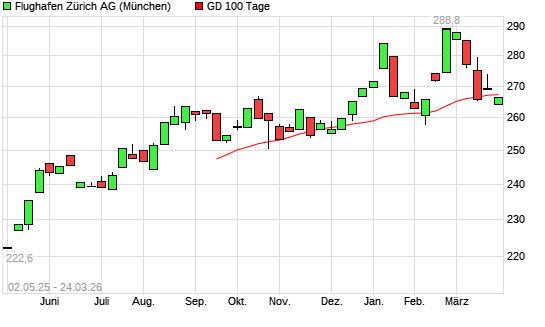 Mit dem Anstieg auf 265,60 EUR hat die Flughafen Zürich-Aktie am 23.03.2026 die 100-Tage-Linie nach oben gekreuzt.