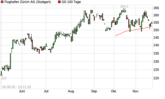 Mit dem Rücksetzer auf 252,80 EUR hat die Flughafen Zürich-Aktie am 21.11.2025 die 100-Tage-Linie nach unten gekreuzt.Der Abstand zur 200-Tage-Linie beträgt aktuell ...weiterlesen