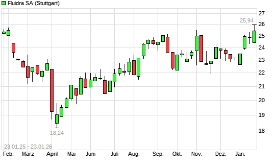 Mit dem Anstieg auf 25,36 EUR hat die Fluidra-Aktie (ISIN ES0137650018) am 22.01.2026 ein neues 6-Monats-Hoch erreicht und damit den Kurs vom 12.09.2025 eingestellt.