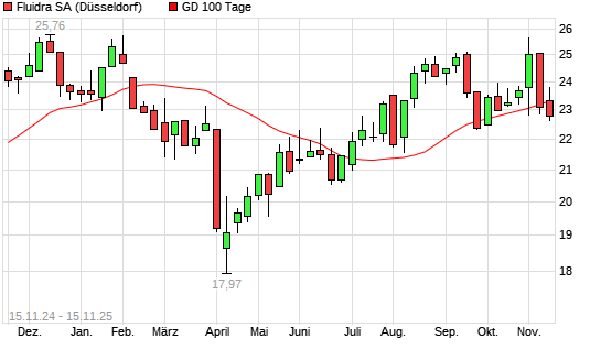 Mit dem Rücksetzer auf 22,84 EUR hat die Fluidra-Aktie am 14.11.2025 die 100-Tage-Linie nach unten gekreuzt.