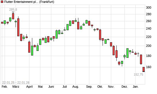 Mit dem Rücksetzer auf 154,95 EUR hat die Flutter Entertainment-Aktie (ISIN IE00BWT6H894) am 21.01.2026 ein neues 12-Monats-Tief erreicht und damit den Kurs vom 20.01.2026 eingestellt.