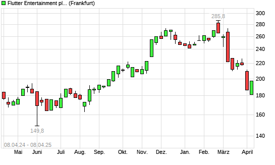 Mit dem Rücksetzer auf 181,20 EUR hat die Flutter Entertainment-Aktie (ISIN IE00BWT6H894) am 07.04.2025 ein neues 6-Monats-Tief erreicht und damit den Kurs vom 04.04.2025 eingestellt.