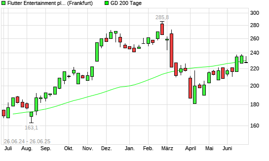 Mit dem Anstieg auf 235,40 EUR hat die Flutter Entertainment-Aktie am 25.06.2025 die 200-Tage-Linie nach oben gekreuzt.